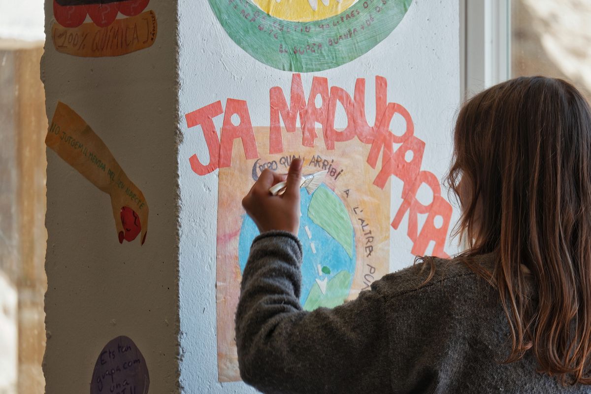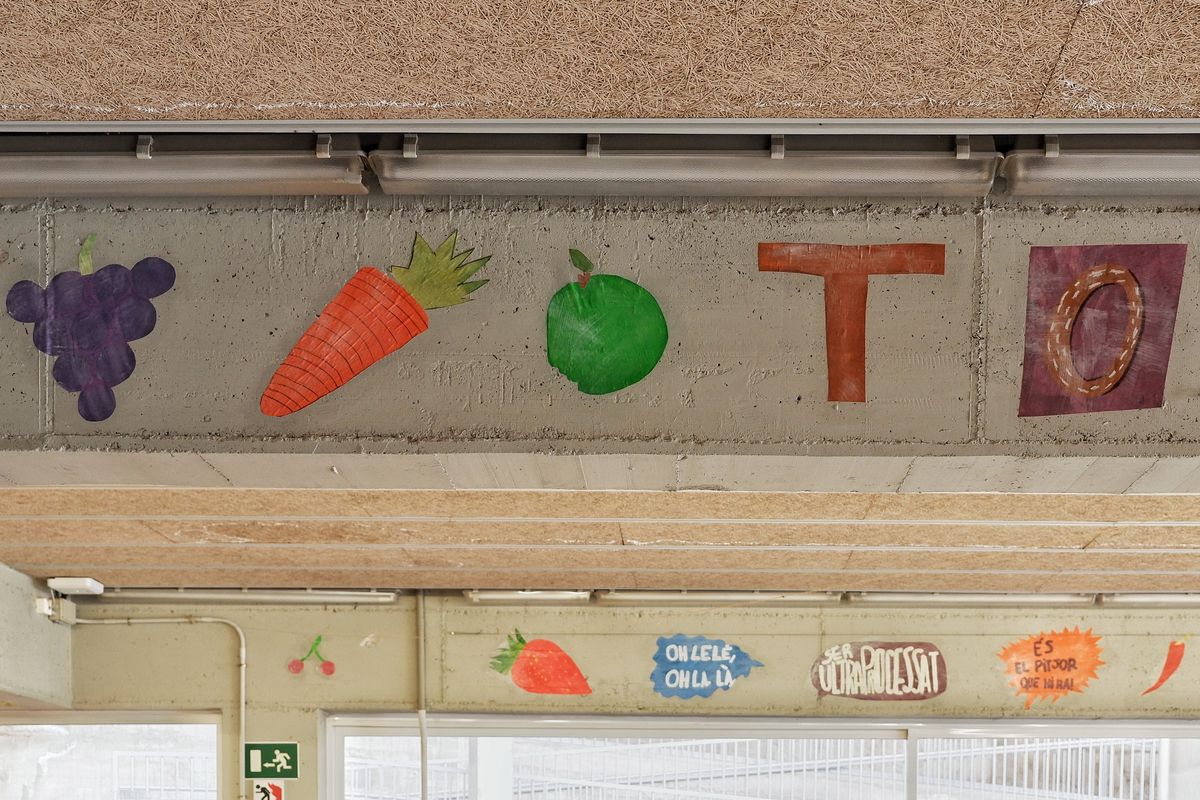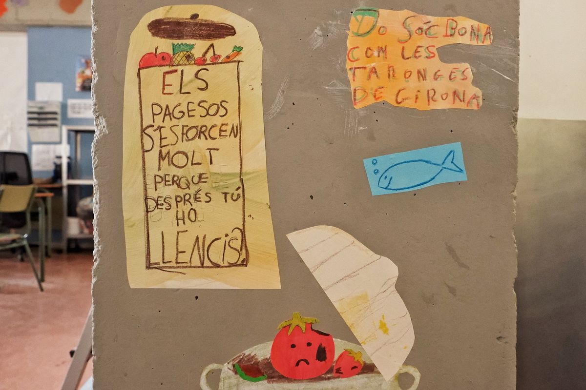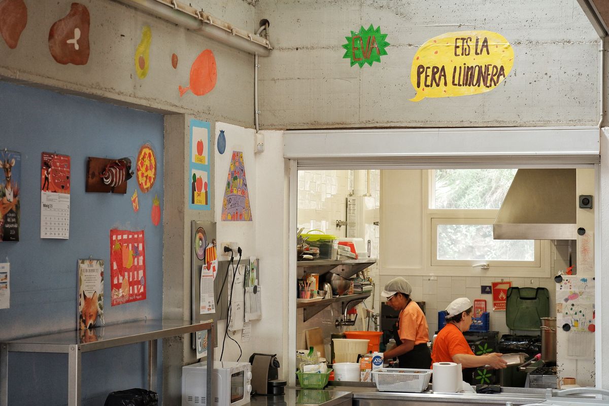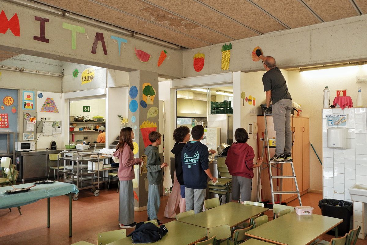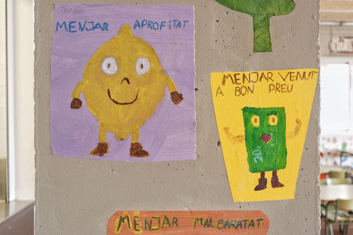 Aquesta primera impressió del lloc no la transmetia únicament l’espai, sinó també qui l’habita i el fa funcionar. El dia a dia de l’escola es nodria de gestos i iniciatives orientades a reforçar valors compartits i tenir cura del seu entorn. Entre elles va sorgir la proposta de l’Eva, la cuinera, de decorar el menjador amb un lema que convidés a reflexionar sobre el malbaratament alimentari.