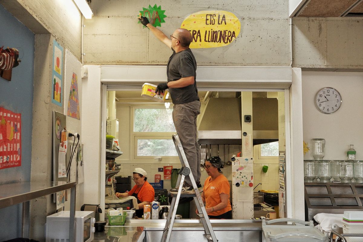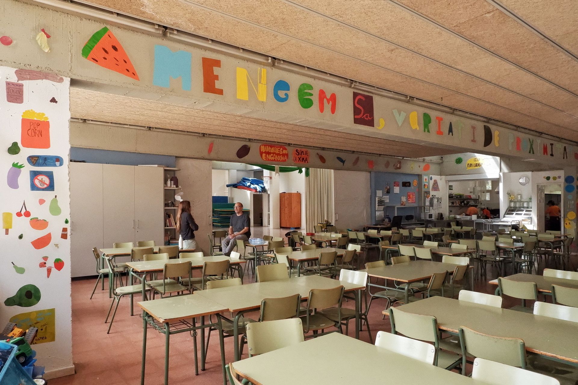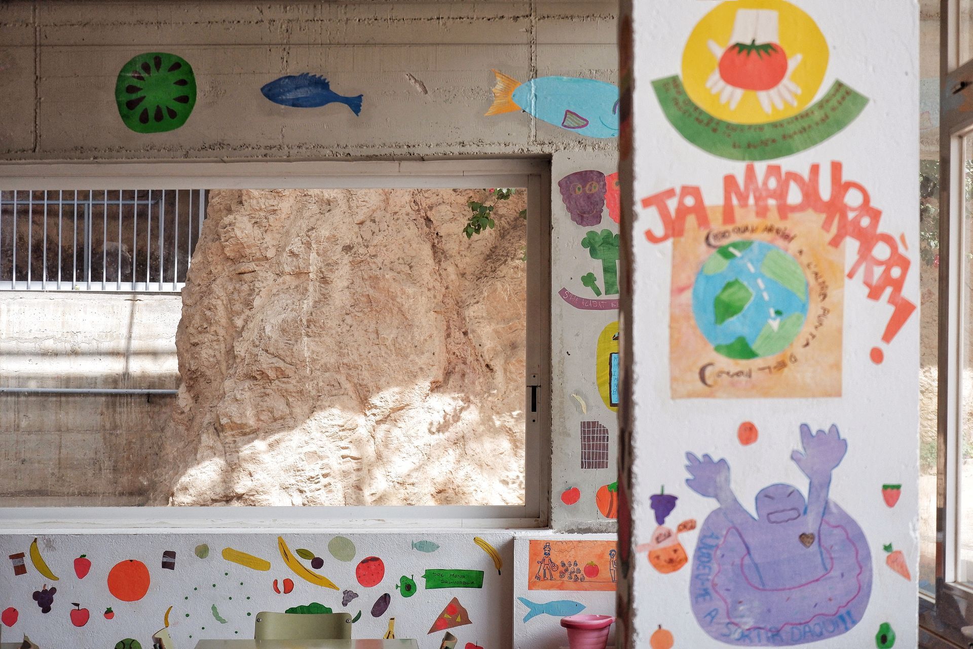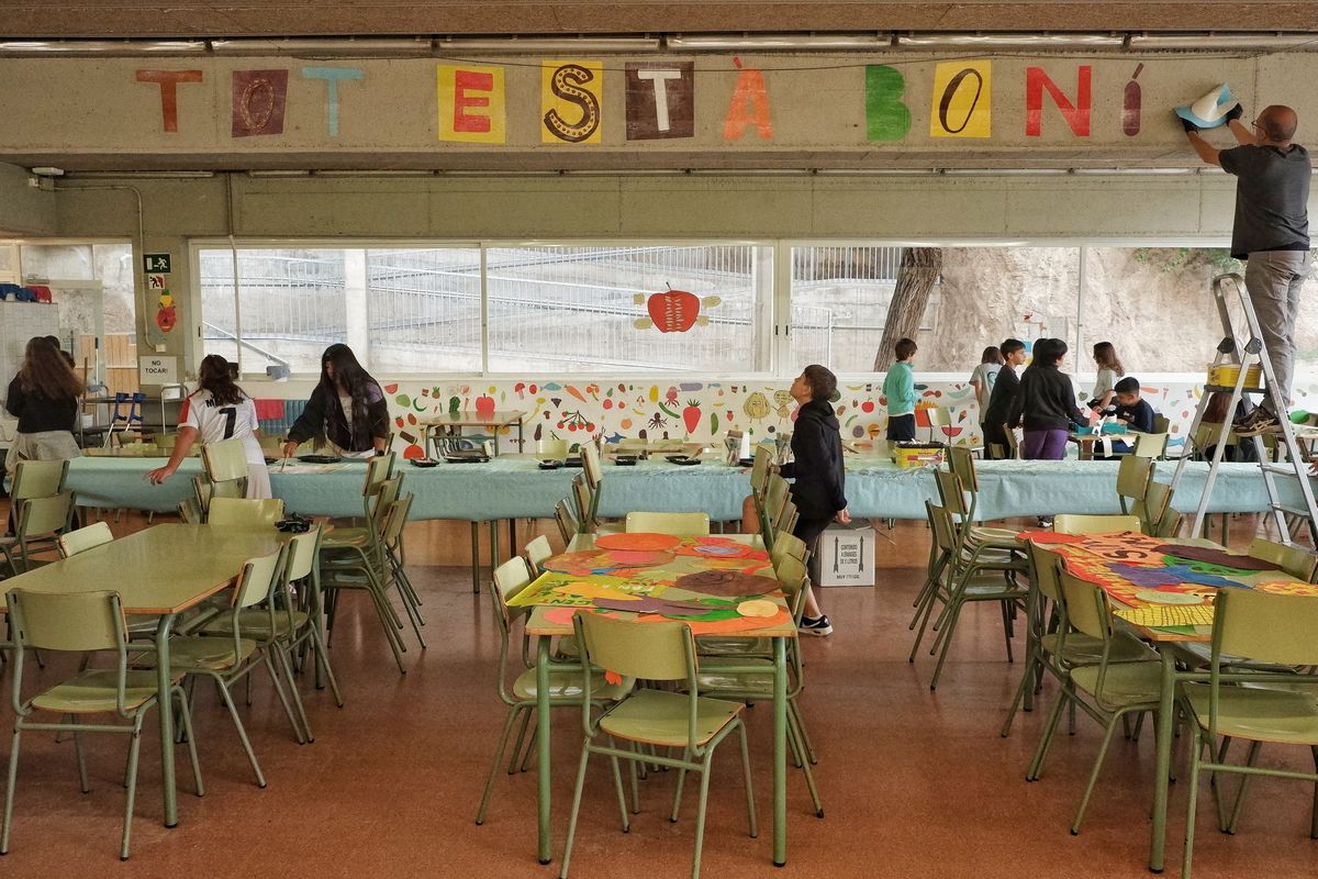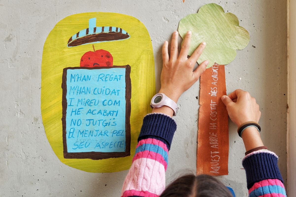 Aquesta primera impressió del lloc no la transmetia únicament l’espai, sinó també qui l’habita i el fa funcionar. El dia a dia de l’escola es nodria de gestos i iniciatives orientades a reforçar valors compartits i tenir cura del seu entorn. Entre elles va sorgir la proposta de l’Eva, la cuinera, de decorar el menjador amb un lema que convidés a reflexionar sobre el malbaratament alimentari.