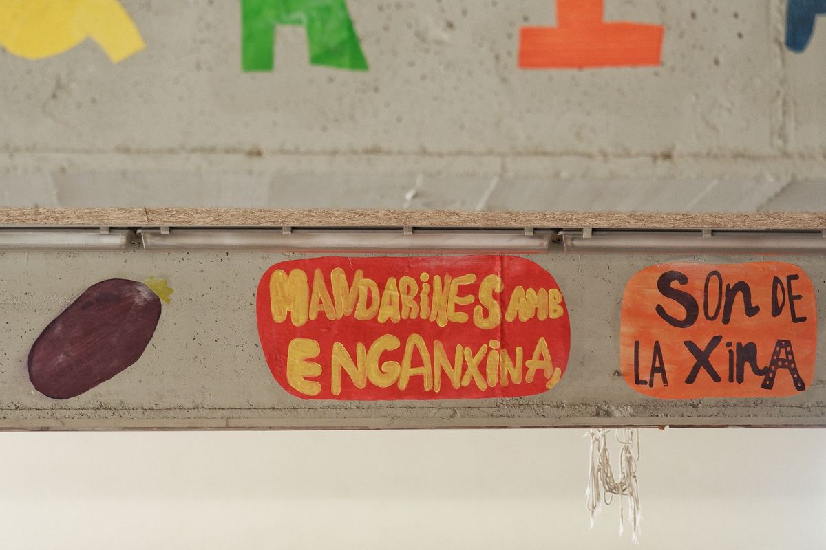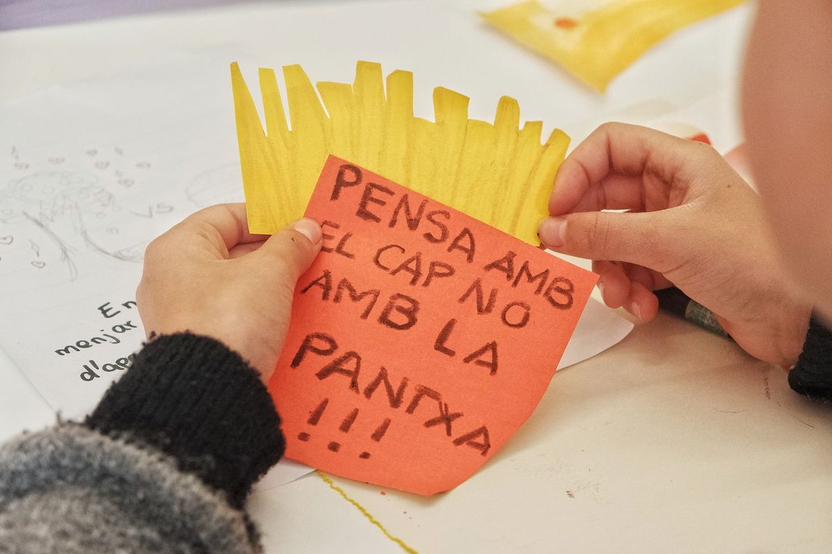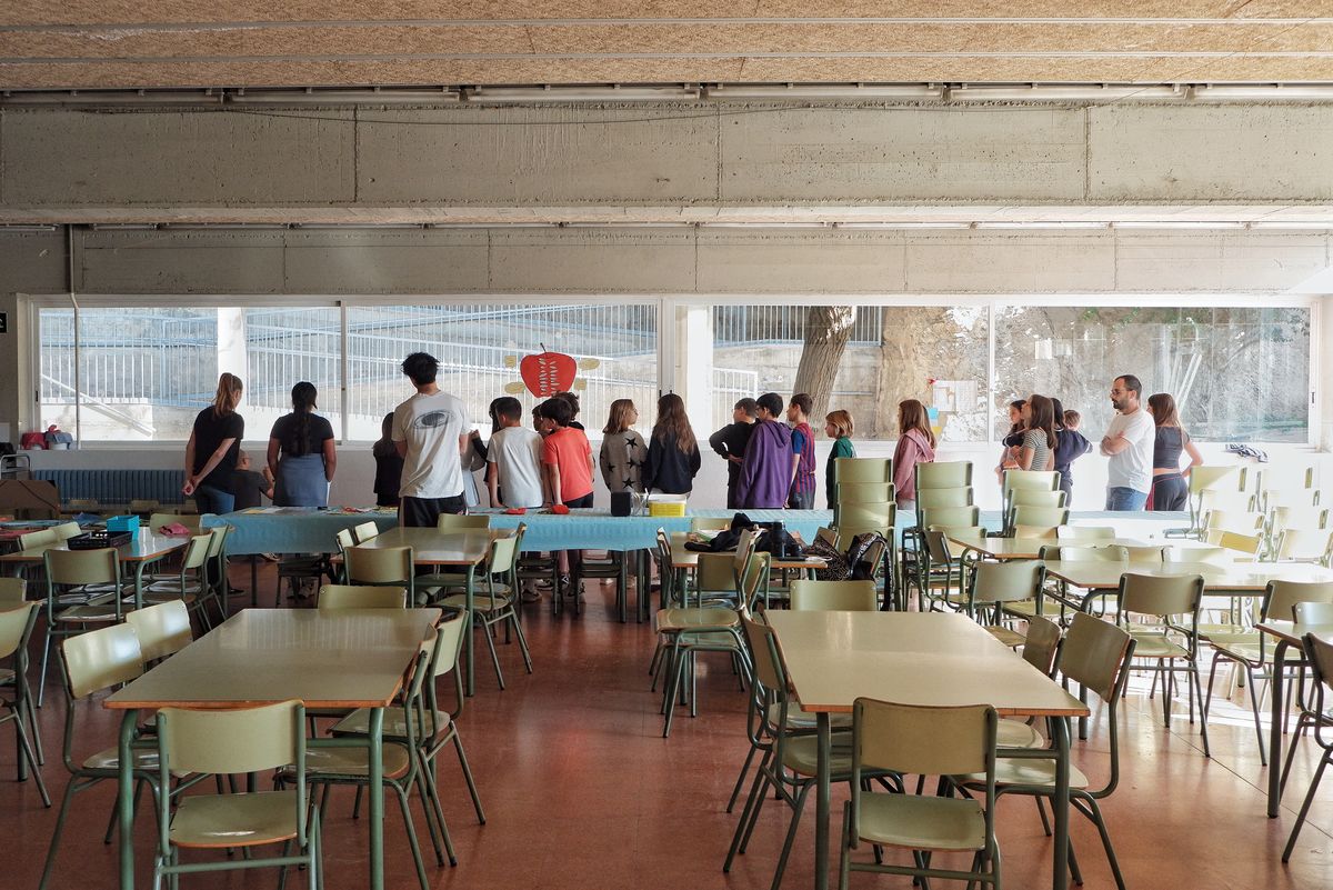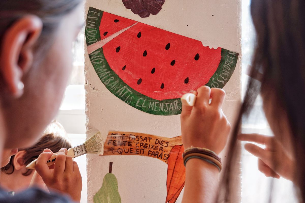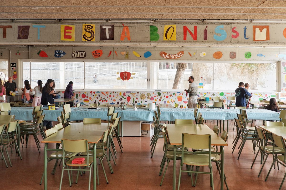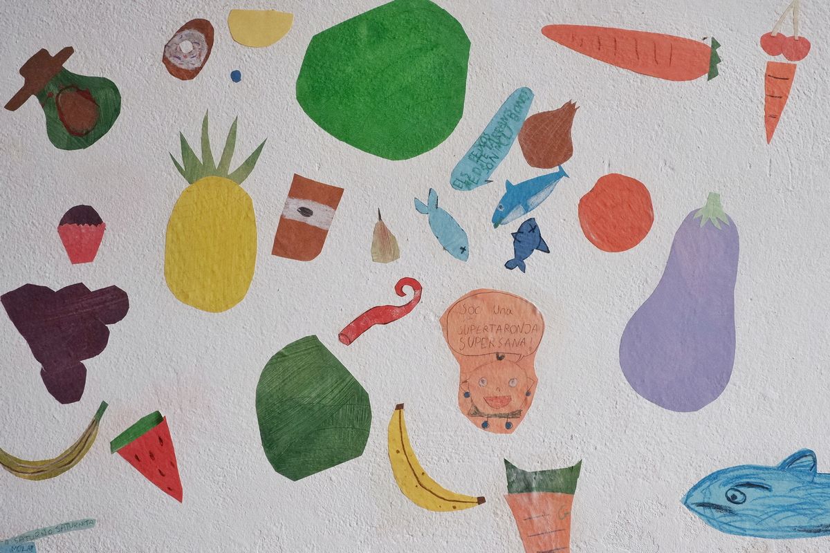 Aquesta primera impressió del lloc no la transmetia únicament l’espai, sinó també qui l’habita i el fa funcionar. El dia a dia de l’escola es nodria de gestos i iniciatives orientades a reforçar valors compartits i tenir cura del seu entorn. Entre elles va sorgir la proposta de l’Eva, la cuinera, de decorar el menjador amb un lema que convidés a reflexionar sobre el malbaratament alimentari.