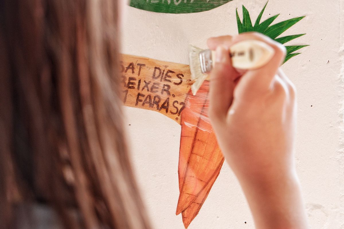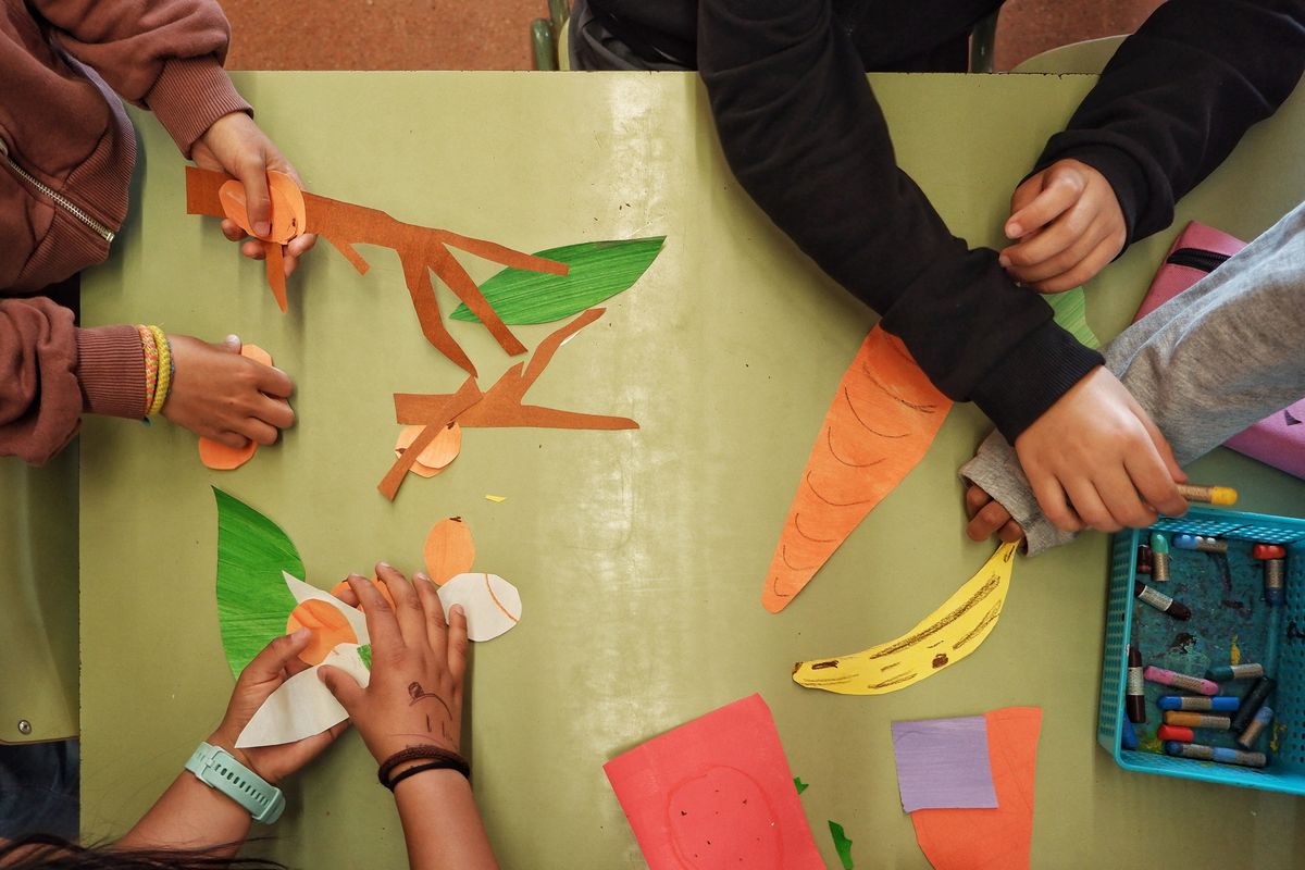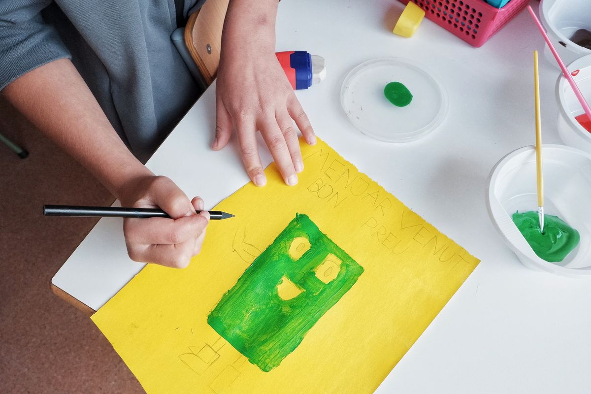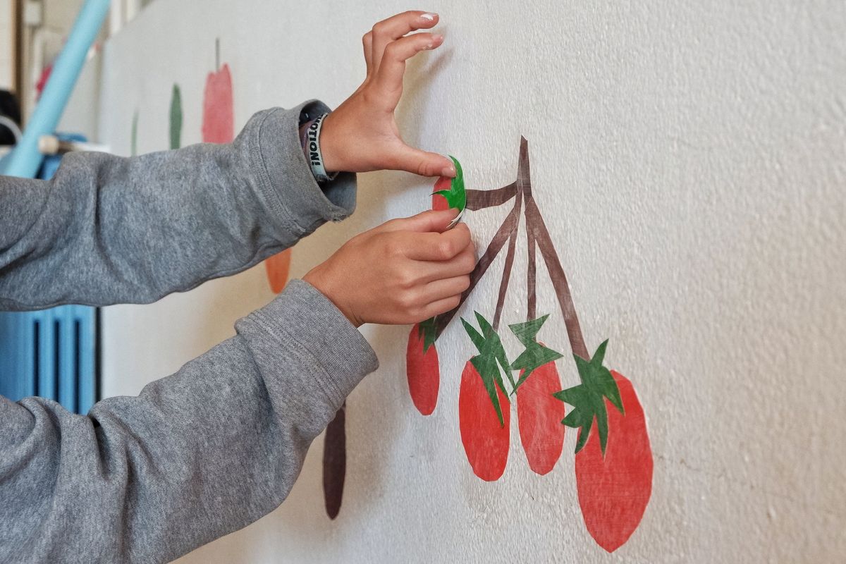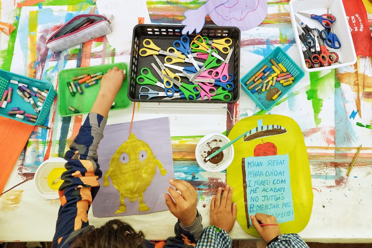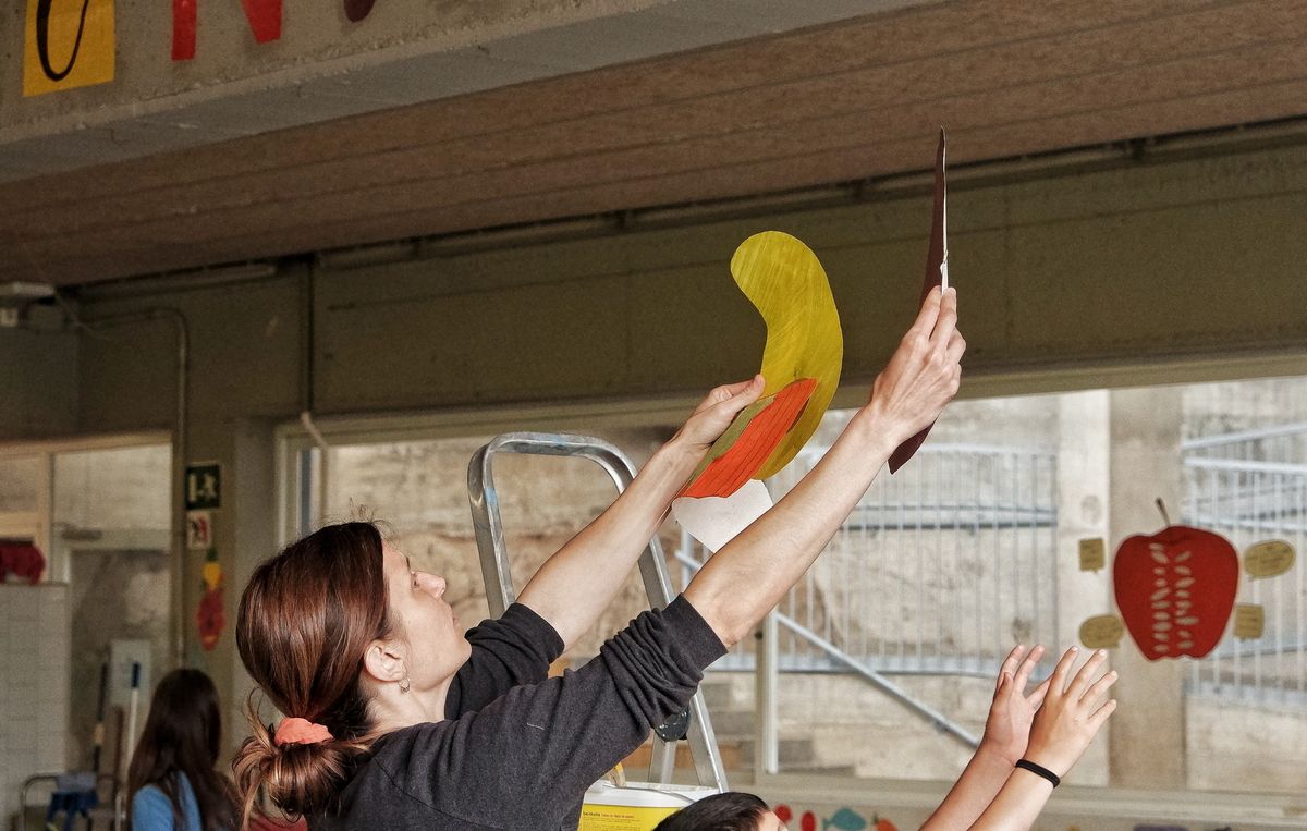 Aquesta primera impressió del lloc no la transmetia únicament l’espai, sinó també qui l’habita i el fa funcionar. El dia a dia de l’escola es nodria de gestos i iniciatives orientades a reforçar valors compartits i tenir cura del seu entorn. Entre elles va sorgir la proposta de l’Eva, la cuinera, de decorar el menjador amb un lema que convidés a reflexionar sobre el malbaratament alimentari.