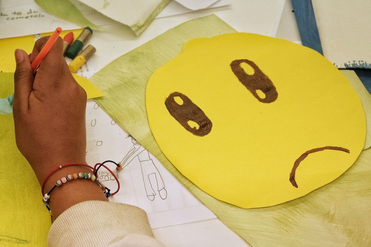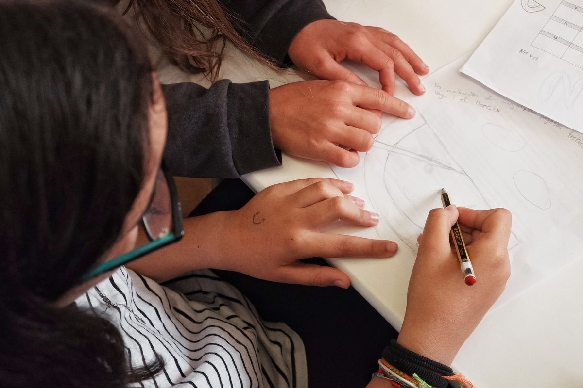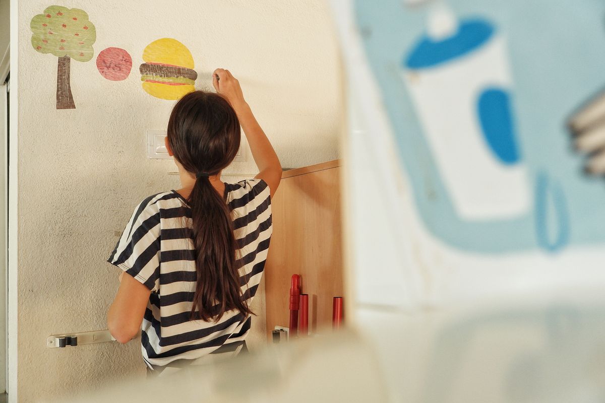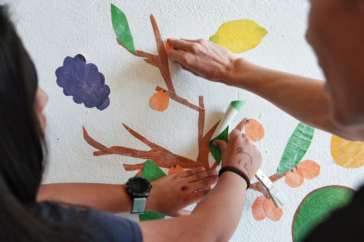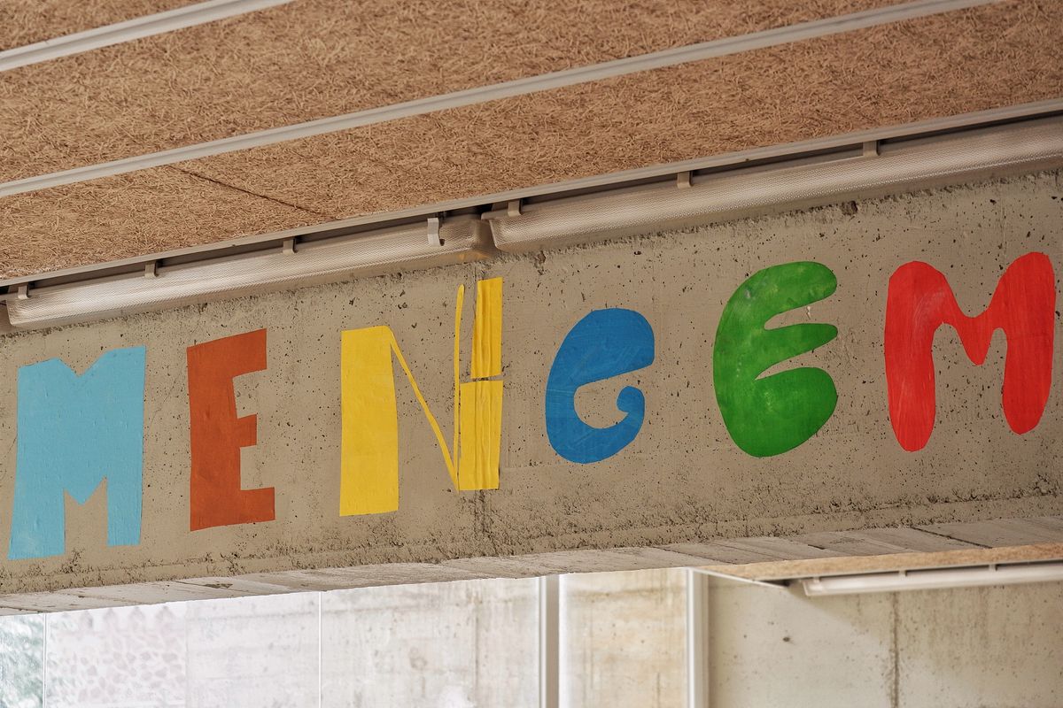 L’espai destinat a la intervenció va ser el menjador de l’escola. Allà, les úniques superfícies disponibles eren una llarga paret d’aproximadament un metre d’alçada i els pilars que sostenen els frontals de formigó del sostre. Com que no comptàvem amb gaire espai perquè els prop de 90 alumnes pintessin directament, vaig optar per la tècnica del paste-up, que permet treballar prèviament els missatges sobre paper retallat i després traslladar-los als suports amb cola. Aquesta tècnica és efímera, respectuosa amb l’entorn i menys invasiva que la pintura directa.