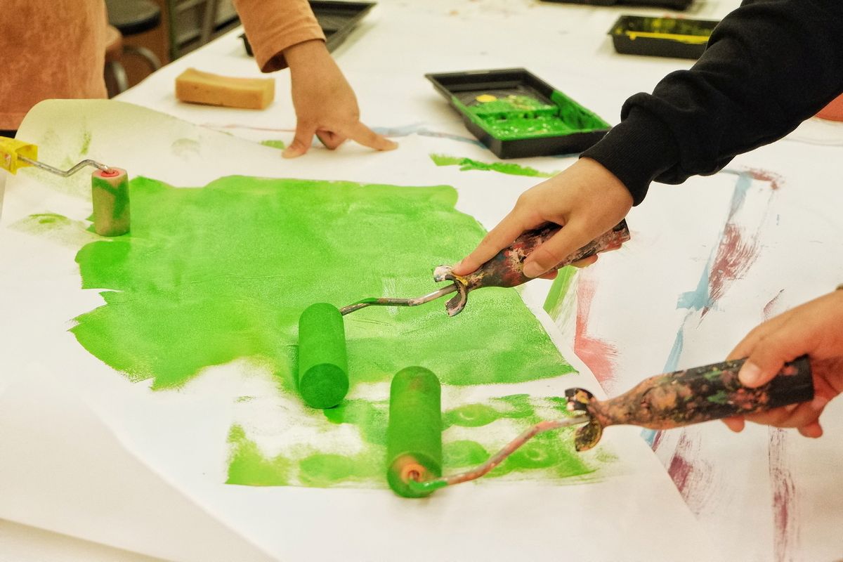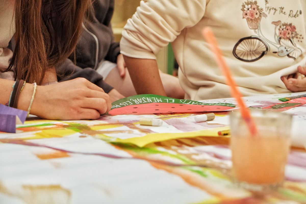 Els alumnes es van organitzar en tres grups per crear missatges reivindicatius. Primer pintaven les tires de paper amb corrons i pinzells, aplicant els colors de fons; després hi traslladaven el dibuix i el text, retallant les peces segons la mida de cada cartell. Vam comptar amb la col·laboració del professorat, que ajudava a coordinar els grups i assegurar que tot el procés transcorregués amb fluïdesa. Els treballs resultants es van organitzar i classificar per preparar les següents sessions.