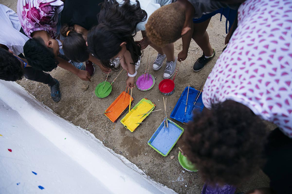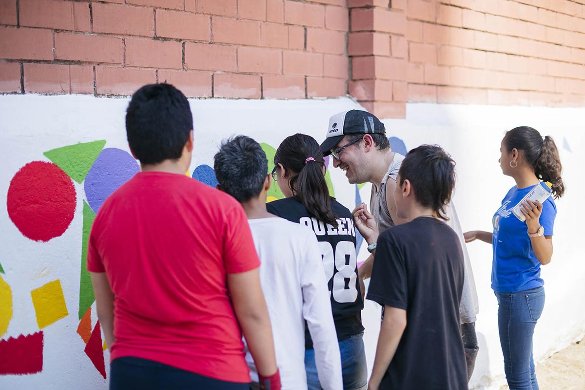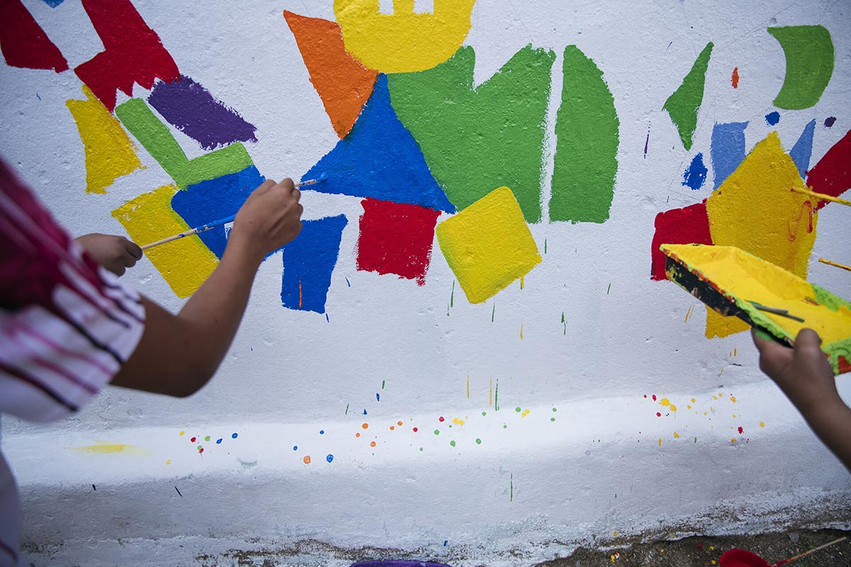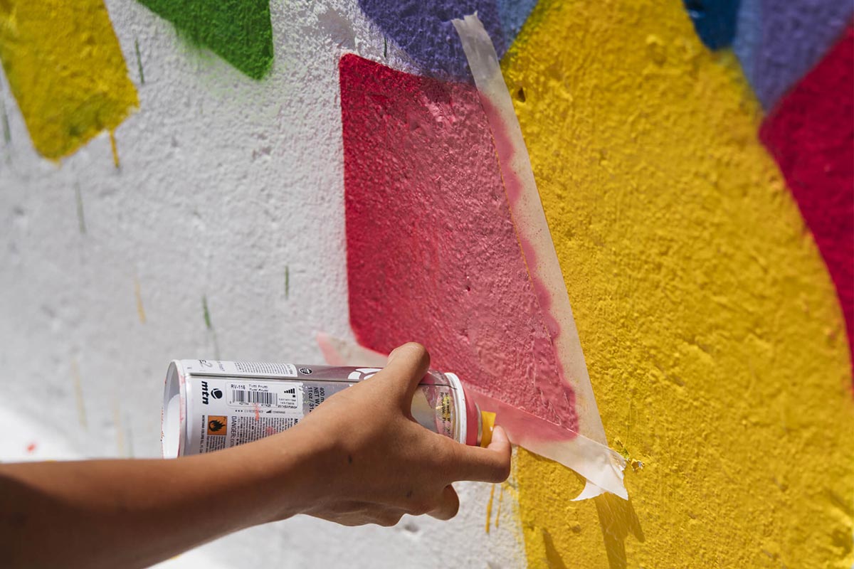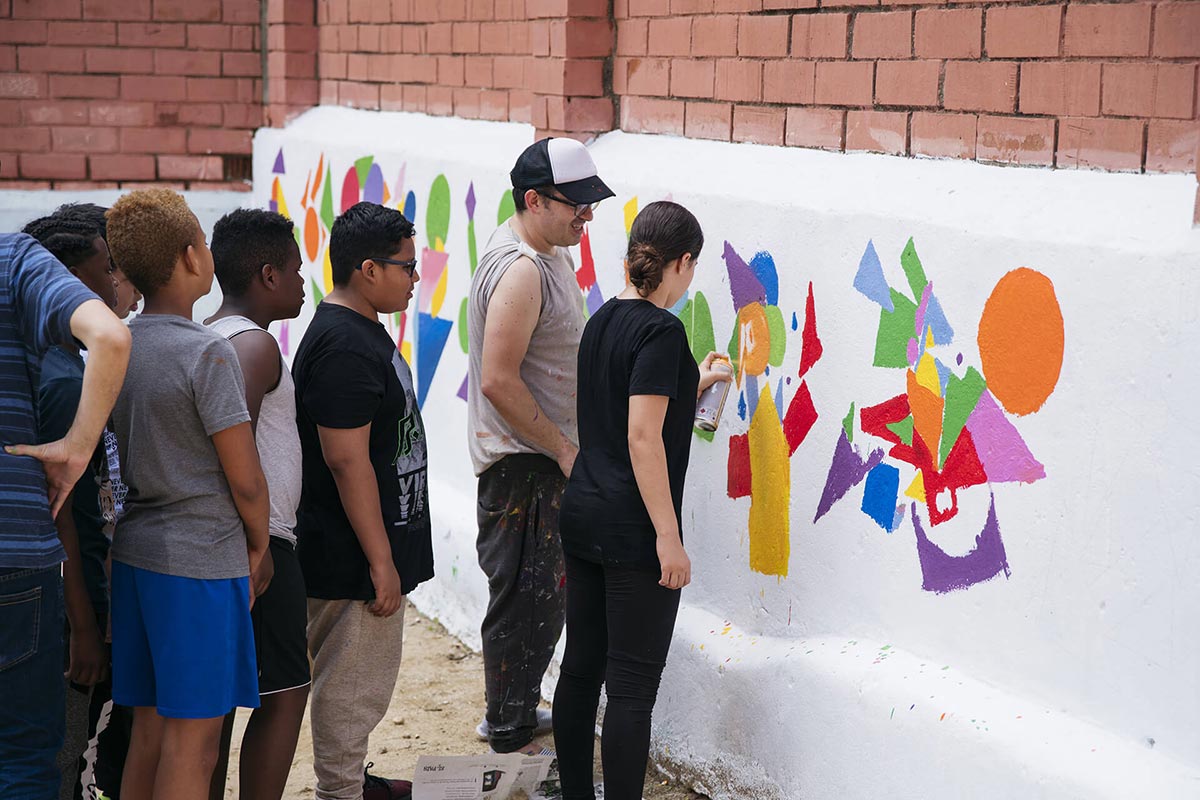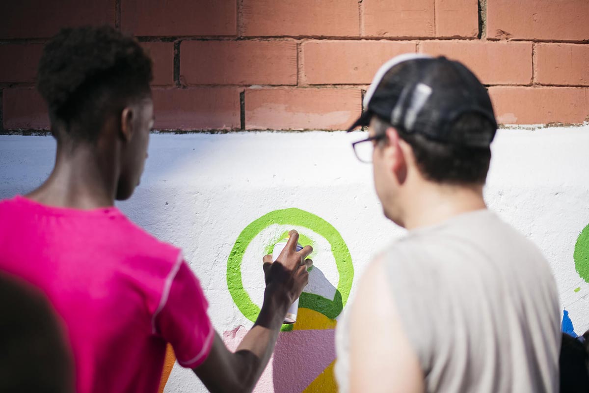 Residents, alumnat i voluntariat van intervenir la paret del pati, utilitzant tècniques de muralisme com la pintura plàstica i l’esprai, sota l’acompanyament didàctic de l’artista Carlos *Spogo.