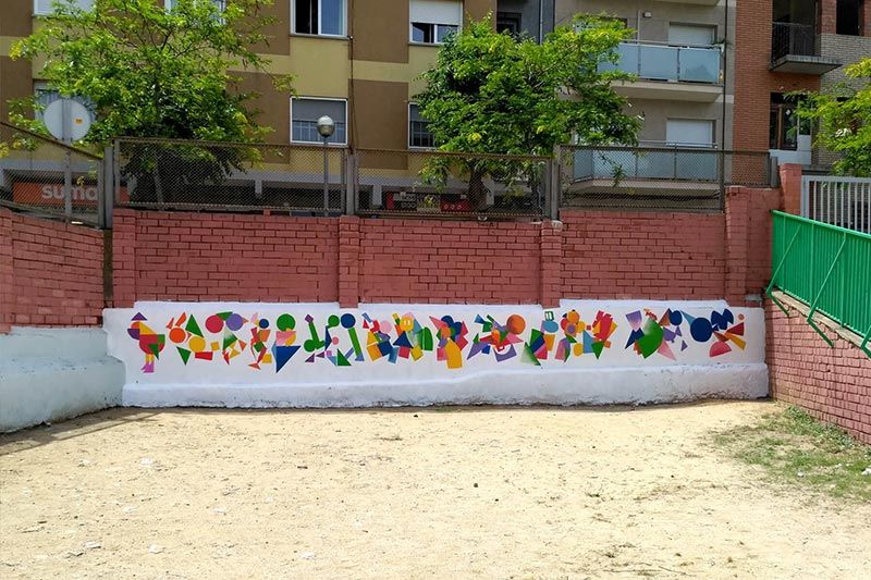 El Instituto Badalona VII me encargó diseñar e impartir un taller artístico que formaba parte del trabajo de síntesis del 2º curso de la ESO. La actividad la realizaron 120 alumnas y alumnos durante cuatro jornadas y se pintaron quince pilares y dos columnas del pasillo de la tercera planta del instituto.